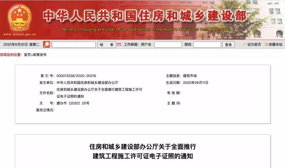 為進一步貫徹落實《國務院關于加快推進全國一體化在線政務服務平臺建設的指導意見》,深化“放管服”改革,提升建筑業(yè)政務服務質量,按照國務院辦公廳電子政務辦公室要求, 近日,住房和城鄉(xiāng)建設部印發(fā)關于全面推行建筑工程施工許可證電子證照的通知,自2021年1月1日起,全國范圍內的房屋建筑和市政基礎設施工程項目全面實行施工許可電子證照(以下簡稱“電子證照”)。電子證照與紙質證照具有同等法律效力。 根據(jù)通知,地方施工許可發(fā)證機關要按照相關要求,規(guī)范數(shù)據(jù)信息內容和證書樣式,完善證書編號、二維碼等編碼規(guī)則,形成全國統(tǒng)一的電子證照版式。同時,應在發(fā)證后5個工作日內,將電子證照文件(含電子印章)及業(yè)務信息上傳至省級建筑市場監(jiān)管一體化工作平臺。省級建筑市場監(jiān)管一體化工作平臺每個工作日應對本行政區(qū)域內的信息進行匯總,并通過部省數(shù)據(jù)對接機制上傳至全國建筑市場監(jiān)管公共服務平臺(以下簡稱“公共服務平臺”)。公共服務平臺進行歸集和存檔,并按要求向國家政務服務平臺報送。 公共服務平臺及微信小程序向社會公眾提供電子證照信息公開查詢以及二維碼掃描驗證服務,并向各省級住房和城鄉(xiāng)建設主管部門實時共享電子證照信息,實現(xiàn)電子證照跨地區(qū)的互聯(lián)互通。地方各級住房和城鄉(xiāng)建設主管部門應在相關辦事場景中持續(xù)推進電子證照應用,通過相關政務服務系統(tǒng)的數(shù)據(jù)共享和業(yè)務協(xié)調,推動實現(xiàn)政務服務事項“一網(wǎng)通辦”。 地方各級住房和城鄉(xiāng)建設主管部門要于2020年9月底前完成相關信息系統(tǒng)的升級改造以及數(shù)據(jù)接口的技術開發(fā)、管理權限認證和數(shù)據(jù)聯(lián)調測試,滿足電子證照業(yè)務開展和信息互聯(lián)互通的技術條件。各省級住房和城鄉(xiāng)建設主管部門要加強對本行政區(qū)域內電子證照業(yè)務的監(jiān)督指導,建立和完善相關管理制度,明確實施主體,細化實施步驟,推動電子證照業(yè)務有序開展和規(guī)范化管理。