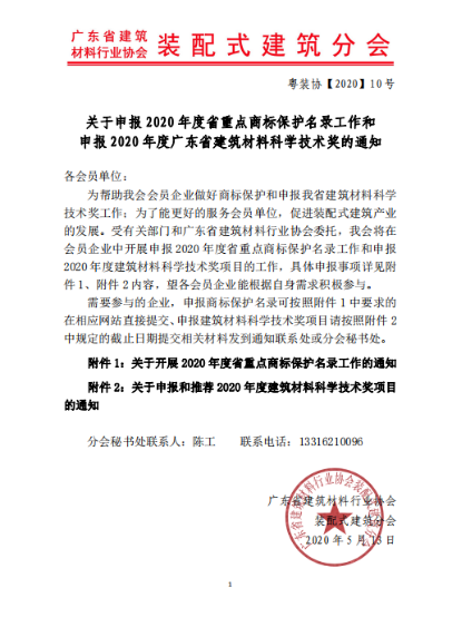 5月13日,我會發(fā)文,傳達關于政府部門和機構關于申報2020年度省重點商標保護名錄工作和申報2020年度廣東省建筑材料科學技術獎的通知。