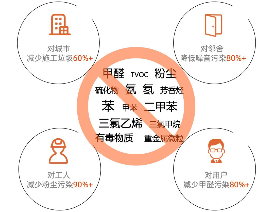 品宅的裝配式內(nèi)裝因全干法施工,流程化拼接,因此施工現(xiàn)場(chǎng)的噪音污染、粉塵污染較傳統(tǒng)裝修降低了80%以上,同時(shí)裝修材料都是品質(zhì)可控的環(huán)保材料,如竹木纖維板、硅酸鈣板、玻纖板等等,因?yàn)槊恳粋€(gè)組成部分都是環(huán)保無(wú)毒無(wú)害的,因此聚集到一個(gè)空間里也不會(huì)產(chǎn)生安全問(wèn)題。保障了施工人員和使用者的生命安全,可以實(shí)現(xiàn)即裝即用。