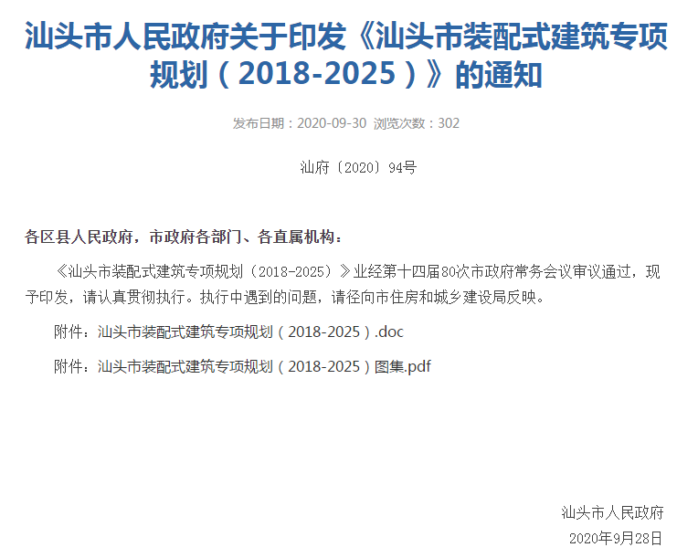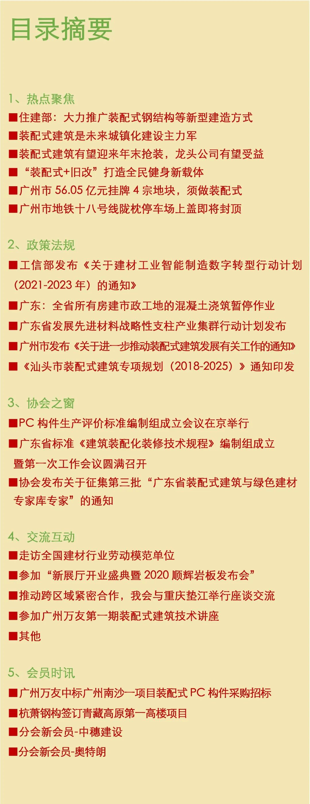 1、熱點(diǎn)聚焦 ■住建部:大力推廣裝配式鋼結(jié)構(gòu)等新型建造方式 建造方式加快轉(zhuǎn)型。大力推廣裝配式鋼結(jié)構(gòu)等新型建造方式,全國(guó)新開(kāi)工裝配式建筑年均增長(zhǎng)55%。促進(jìn)建筑節(jié)能和綠色建筑快速發(fā)展,城鎮(zhèn)新建建筑執(zhí)行節(jié)能強(qiáng)制性標(biāo)準(zhǔn)比例基本達(dá)到100%。 ■裝配式建筑是未來(lái)城鎮(zhèn)化建設(shè)主力軍 中國(guó)城鎮(zhèn)化建設(shè)工作委員會(huì)主任、中國(guó)國(guó)際科技促進(jìn)會(huì)高新科技專業(yè)委員會(huì)常務(wù)副主任劉勝嘉在接受記者采訪指出,裝配式建筑在城鎮(zhèn)化建設(shè)上有大量市場(chǎng)。他舉例強(qiáng)調(diào),推廣裝配式建筑是黨中央國(guó)務(wù)院的決策和部署。裝配式建筑工廠化生產(chǎn)建造速度快,在抗震、防火、高溫,沒(méi)有污染,和傳統(tǒng)的建筑材料相比,它有很大的優(yōu)勢(shì)。裝配式建筑這一既符合產(chǎn)業(yè)政策又有廣闊市場(chǎng)前景的新型產(chǎn)業(yè),在政策和市場(chǎng)需求的雙重推動(dòng)下,必將迎來(lái)迅猛的發(fā)展。 ■裝配式建筑有望迎來(lái)年末搶裝,龍頭公司有望受益 2020年是《“十三五”裝配式建筑行動(dòng)方案》實(shí)現(xiàn)裝配式建筑第一階段目標(biāo)的“大考”期,從當(dāng)前時(shí)點(diǎn)來(lái)看,建筑業(yè)有望進(jìn)入搶進(jìn)度階段,裝配式建筑行業(yè)龍頭公司有望迎來(lái)業(yè)績(jī)的進(jìn)一步改善。 ■“裝配式+舊改”打造全民健身新載體 近日,國(guó)務(wù)院辦公廳印發(fā)了《關(guān)于加強(qiáng)全民健身場(chǎng)地設(shè)施建設(shè)發(fā)展群眾體育的意見(jiàn)》。2012年以來(lái),國(guó)家體育總局會(huì)同國(guó)家發(fā)展改革委組織實(shí)施《“十二五”公共體育設(shè)施建設(shè)規(guī)劃》《“十三五”公共體育普及工程實(shí)施方案》,投入中央資金支持地方建設(shè)完善體育公園等場(chǎng)地設(shè)施。據(jù)國(guó)家體育總局副局長(zhǎng)李建明介紹,“十四五”期間將在全國(guó)新建或改擴(kuò)建1000個(gè)左右體育公園。 ■廣州市56.05億元掛牌4宗地塊,須做裝配式 據(jù)廣州公共資源交易中心消息,10月26日、27日,廣州市掛牌4宗地塊,包括3宗居住用地,1宗商住用地??偲鹗純r(jià)560524萬(wàn)元。競(jìng)得人須采用裝配式建筑的建造方式。 ■廣州市地鐵十八號(hào)線隴枕停車場(chǎng)上蓋即將封頂 近日,廣州市地鐵十八號(hào)線隴枕停車場(chǎng)上蓋施工現(xiàn)場(chǎng)正在緊張施工中。廣州市地鐵十八號(hào)線隴枕停車場(chǎng)上蓋面積約8.42萬(wàn)平方米,其中4萬(wàn)平方米采用裝配式建筑設(shè)計(jì),是我國(guó)華南地區(qū)目前地鐵在建最大裝配式建筑,即將實(shí)現(xiàn)上蓋封頂。 2、政策法規(guī) ■工信部發(fā)布《關(guān)于建材工業(yè)智能制造數(shù)字轉(zhuǎn)型行動(dòng)計(jì)劃(2021-2023年)的通知》 日前,工業(yè)和信息化部辦公廳發(fā)布關(guān)于印發(fā)《建材工業(yè)智能制造數(shù)字轉(zhuǎn)型行動(dòng)計(jì)劃(2021-2023年)》的通知。計(jì)劃中提到,在新一代信息通信技術(shù)融合場(chǎng)景方向中,支持建材企業(yè)利用區(qū)塊鏈技術(shù)實(shí)現(xiàn)與上下游產(chǎn)業(yè)鏈的產(chǎn)品交易、信息追溯、質(zhì)量管理等功能,保證數(shù)據(jù)安全,逐步深化應(yīng)用。 ■廣東:全省所有房建市政工地的混凝土澆筑暫停作業(yè) 10月12日廣東省住建廳決定,從即日起組織開(kāi)展為期1個(gè)月的模板坍塌安全隱患專項(xiàng)排查整治,全省所有房屋市政工程工地的混凝土澆筑暫停作業(yè)。 ■廣東省發(fā)展先進(jìn)材料戰(zhàn)略性支柱產(chǎn)業(yè)集群行動(dòng)計(jì)劃(2021—2025年)發(fā)布 日前,廣東省人民政府舉行培育發(fā)展戰(zhàn)略性支柱產(chǎn)業(yè)集群和戰(zhàn)略性新興產(chǎn)業(yè)集群新聞發(fā)布會(huì),向社會(huì)正式發(fā)布了20個(gè)戰(zhàn)略性產(chǎn)業(yè)集群的行動(dòng)計(jì)劃。這是繼今年5月廣東出臺(tái)《關(guān)于培育發(fā)展戰(zhàn)略性支柱產(chǎn)業(yè)集群和戰(zhàn)略性新興產(chǎn)業(yè)集群的意見(jiàn)》后更為具體的實(shí)施方案。 ■廣州市發(fā)布《關(guān)于進(jìn)一步推動(dòng)裝配式建筑發(fā)展有關(guān)工作的通知》 日前,廣州市工程建設(shè)項(xiàng)目審批制度改革試點(diǎn)工作領(lǐng)導(dǎo)小組辦公室發(fā)布《關(guān)于進(jìn)一步推動(dòng)我市裝配式建筑發(fā)展有關(guān)工作的通知》。通知提出,要全面實(shí)施全裝修:在裝配式建筑中全面推行全裝修,實(shí)行裝飾裝修與土建協(xié)同設(shè)計(jì)、施工,推動(dòng)傳統(tǒng)裝修企業(yè)轉(zhuǎn)型,推廣一站式、菜單式服務(wù),滿足消費(fèi)者的個(gè)性化需求;大力推進(jìn)裝配化裝修,推動(dòng)裝修集成化、部品化,促進(jìn)設(shè)備管線集成技術(shù)及一體式隔墻、一體式地板、整體式吊頂、集成式廚衛(wèi)、智能家居等產(chǎn)品、材料的綜合應(yīng)用,進(jìn)一步減少現(xiàn)場(chǎng)濕作業(yè),提升裝修品質(zhì)。 ■《汕頭市裝配式建筑專項(xiàng)規(guī)劃(2018-2025)》通知印發(fā) 日前,汕頭市人民政府印發(fā)《汕頭市裝配式建筑專項(xiàng)規(gu
