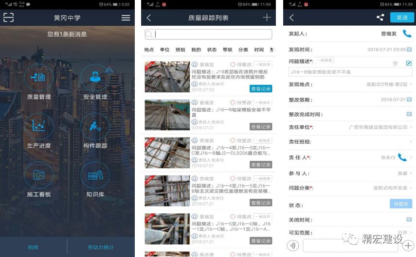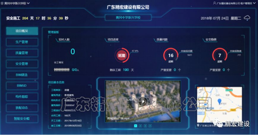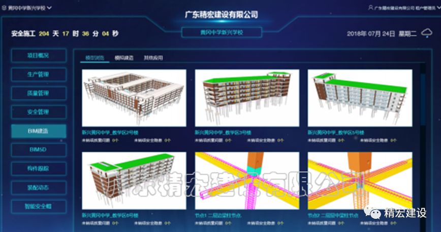 黃岡中學新興學校項目實施過程中,精宏建設在前期裝配式EPC項目的基礎上,力求在裝配式建筑標準化設計、工廠化生產(chǎn)、裝配化施工、信息化管理四個方面做得更加完善,更加注重技術創(chuàng)新應用和互聯(lián)網(wǎng)+裝配式建筑的信息化應用,按精宏建設信息化應用示范項目標準進行建設和實踐,打造“數(shù)字精宏”。項目通過運用質(zhì)量安全管控平臺、工地寶、智能安全帽等信息化技術手段,對項目質(zhì)量、安全、進度進行全方位的把控,建設智慧工地,同時也針對預制構件進行了全流程的二維碼追蹤管理,大力提升項目實施過程中的信息化管理水平,最終實現(xiàn)了從規(guī)劃、設計、采購、生產(chǎn)到施工的全項目建設周期的信息化管理。