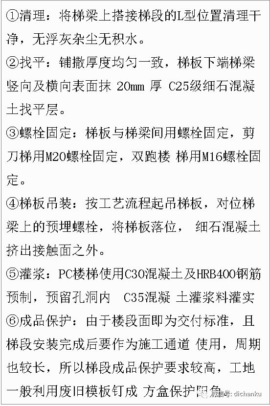 萬科預(yù)制內(nèi)墻板構(gòu)造篇 1.萬科墻板安裝工藝流程 2.“一字型”連接節(jié)點(diǎn) ①嵌縫帶施工時(shí)間。 ②基層處理。 ③嵌縫帶寬度不得小于規(guī)定值。 ④嵌縫帶不得外露。 ⑤檢查及修補(bǔ)。 3.“L 型”連接節(jié)點(diǎn) 4.預(yù)制內(nèi)墻板與結(jié)構(gòu)墻柱連接節(jié)點(diǎn) ①錨固鋼筋錨入墻板深度不得小于 10mm。 ②L 型、一型連接兩道嵌縫帶。 ③墻板與結(jié)構(gòu)墻柱連接平面齊平。 5.墻板與結(jié)板底、梁底連接節(jié)點(diǎn) 6.預(yù)制內(nèi)墻板與結(jié)構(gòu)樓面連接節(jié)點(diǎn) ①基層清理: 清除樓面墻板安裝位置處灰塵并灑水濕潤。 ②安裝墻板: 按照墻板安裝工藝流程安裝墻板。 ③底部填塞:墻板安裝經(jīng)檢驗(yàn)合格24h內(nèi),用細(xì)石混凝土(高度>30mm)或1:2 干硬性水泥砂漿(高度≤30mm)將板的底部填塞密實(shí)(采用砂漿灌縫專用工 具)。 ④封堵木楔孔:底部填塞完成 7 天后,撤出木楔并用 1:2 干硬性水泥砂漿填實(shí)木楔孔。 ①施工開始時(shí)間。 ②木楔撤出時(shí)間。 ③封堵撤出木楔后留下的孔洞。 7.預(yù)制內(nèi)墻板與反坎連接節(jié)點(diǎn) ①反坎位置及尺寸精度。 ②反坎成品保護(hù)。 ③反坎底部填塞飽滿。 8.預(yù)制內(nèi)墻板吊掛重物節(jié)點(diǎn)構(gòu)造 ①安裝墻板: 按照墻板安裝工藝流程安裝墻板。 ②粘貼瓷磚: 廚衛(wèi)間內(nèi)墻板面使用水泥砂漿(或瓷磚專用膠)粘貼飾面瓷 磚。 ③定位: 根據(jù)設(shè)計(jì)要求在墻磚墻面上確定懸掛點(diǎn)位置。 ④安裝膨脹螺栓: 瓷磚粘貼完成 7 天后,按照確定位置將 6mm×80mm 膨脹螺 栓打入內(nèi)墻板面。 ①定位準(zhǔn)確。 ②打膨脹螺栓保持角度垂直。 ③懸掛重物時(shí)間。 萬科PC樓梯構(gòu)造篇 9.萬科PC樓梯梯梁安裝節(jié)點(diǎn) ①找平混凝土等級,填充密實(shí)。 ②灌漿料等級以及灌漿密實(shí)程度。 ③成品保護(hù)及時(shí)到位。 ?萬科精工手冊4.0(PC技術(shù)篇)分享完畢......