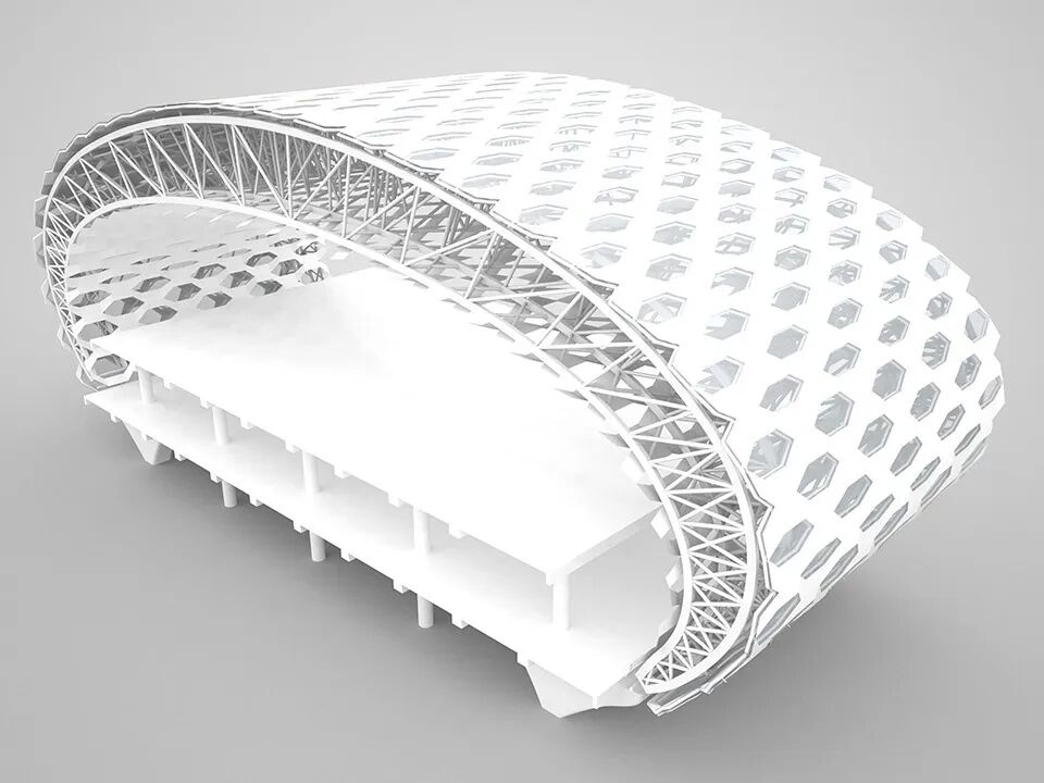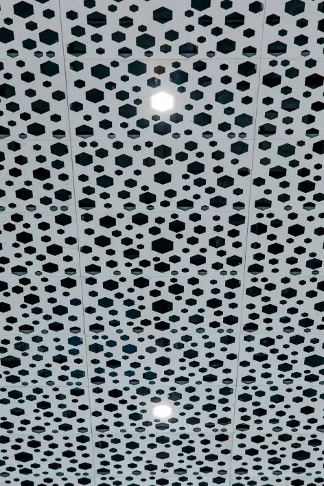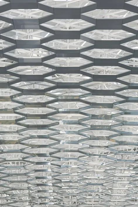 該項目的代表性元素是包裹住建筑結(jié)構(gòu)的蜂窩狀雙層表皮。自然光線可以從其雙層表皮結(jié)構(gòu)中穿過,在建筑內(nèi)部形成斑駁的光影效果。表皮的覆層由有六邊形蜂巢狀開口的金屬,與不同規(guī)格的玻璃窗組成,其中部分可以根據(jù)需要開啟。