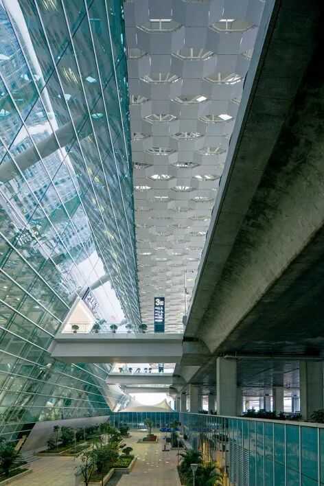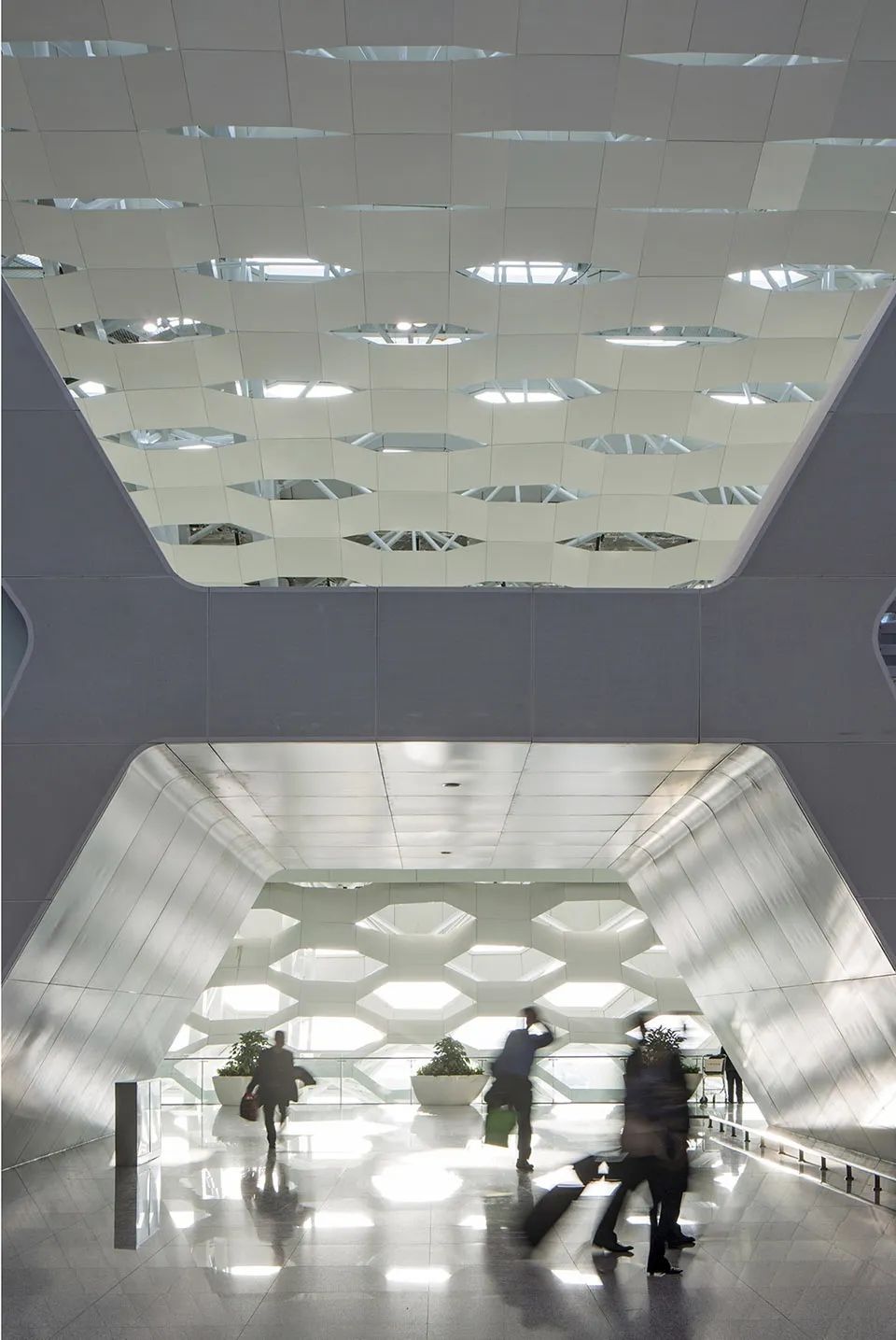 室內(nèi)設計同樣由Fuksas操刀。網(wǎng)吧,登機服務臺,安檢,登機口,海關邊檢區(qū)等設施都被設計成簡潔的形象,不銹鋼飾面反射著天花板上的蜂窩狀表皮,使室內(nèi)與建筑融為一體。